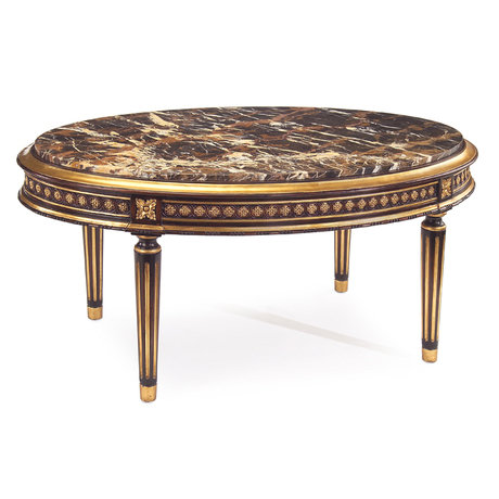 Столик выполнен в черной отделке с богатой золотой резьбой. Царга стола декорирована розетками из позолоченной бронзы. Столешница изготовлена из мрамора Bruno Sienna.
